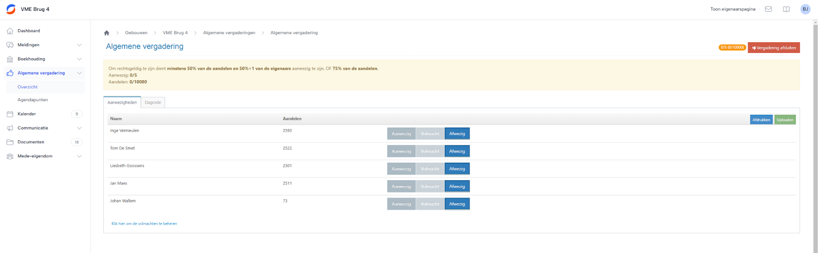 Bij de aanwezigheden kan je aanduiden wie aanwezig is en wie afwezig. Je kan hier ook zien wie een volmacht heeft gegeven of nog een volmacht toevoegen. Je kan deze lijst ook afdrukken (zie voorbeeld) voor mee te nemen in de vergadering.