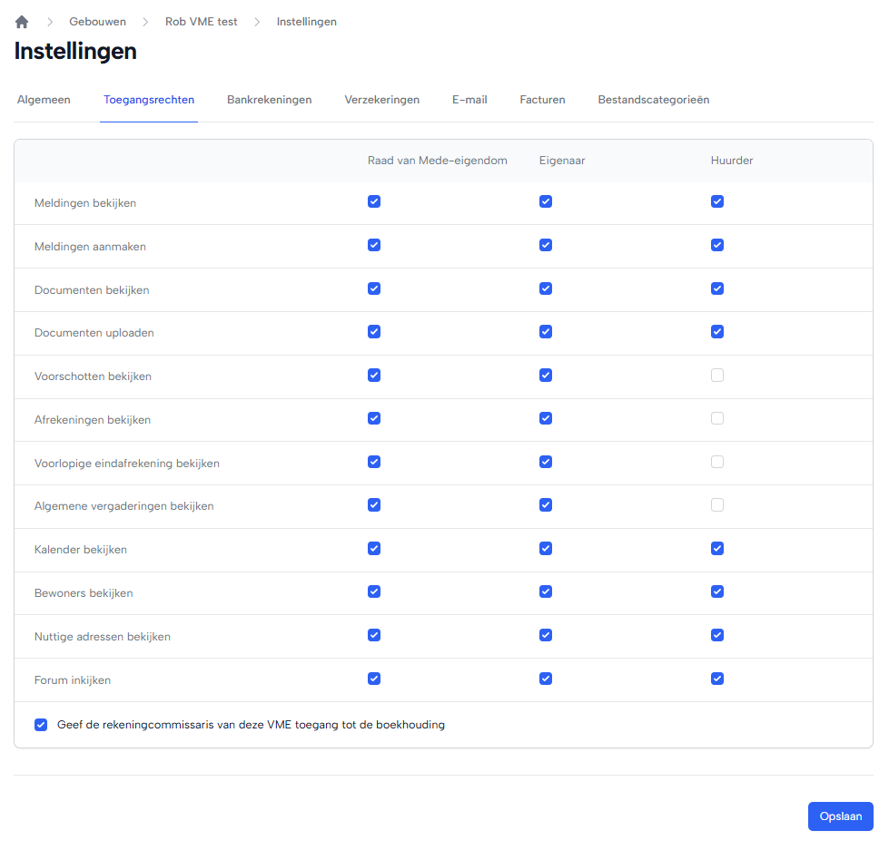 Hier kan je toegang geven of beperken tot de afzonderlijke onderdelen van je gebouw, zoals meldingen, meterstanden, documenten, afrekeningen etc… De toegang is afzonderlijk in te stellen voor eigenaars, huurders en leden van de Raad van Mede-eigenaars.