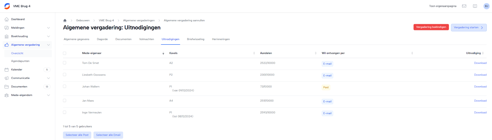 Rechtsboven krijg je ook een altijd overzicht van de aanwezigen (samen met de aanwezige aandelen) en de duurtijd van de vergadering.