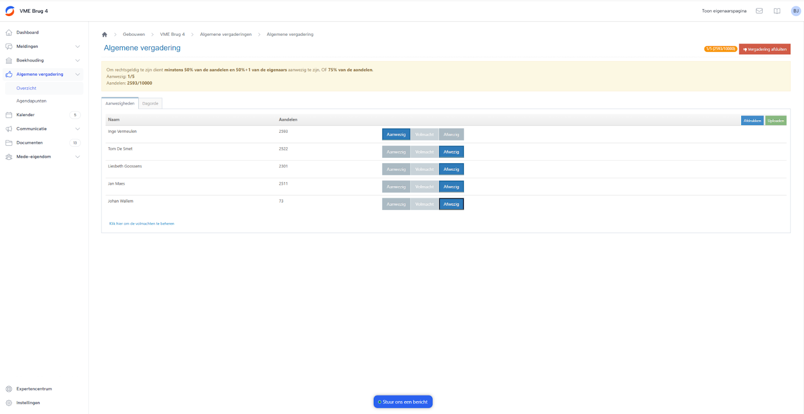 Bij de aanwezigheden kan je aanduiden wie aanwezig is en wie afwezig. Je kan hier ook zien wie een volmacht heeft gegeven of nog een volmacht toevoegen. Je kan deze lijst ook afdrukken (zie voorbeeld) voor mee te nemen in de vergadering.