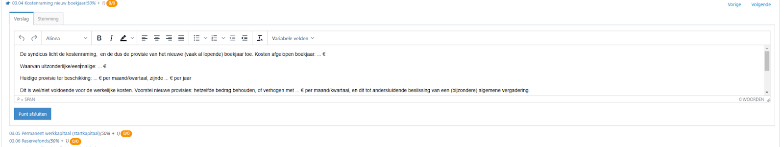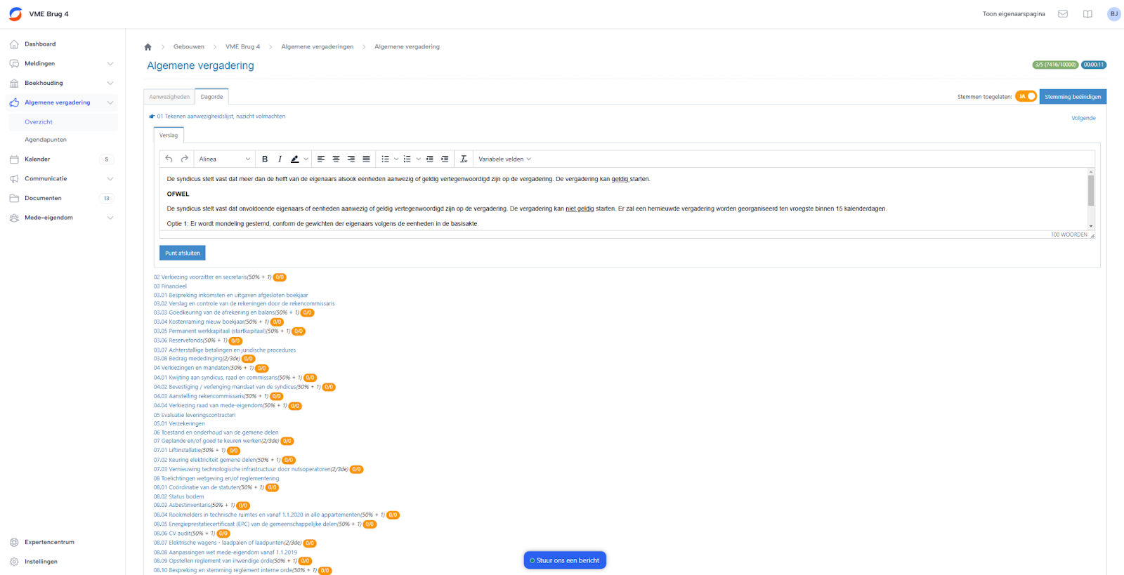 Bij de dagorde kan je de verschillende vergaderpunten overlopen en stemmingen hierover laten uitvoeren via SyndicusOnline. Houd deze tab open tijdens je vergadering om zo elk punt te overlopen. Per punt krijg je de mogelijkheid om notities toe te voegen die dan automatisch in het verslag komen te staan.