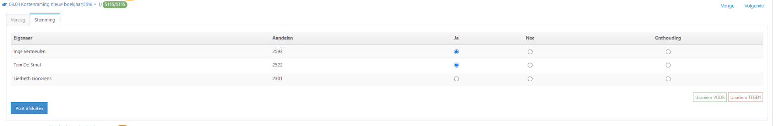 Wanneer een stemming vereist is, krijg je ook een tab voor de stemmingen. De deelnemers kunnen nu via hun eigen inlog deze stemming meevolgen en uitvoeren. Je kan hier ook zelf de stemming ingeven als Syndicus.