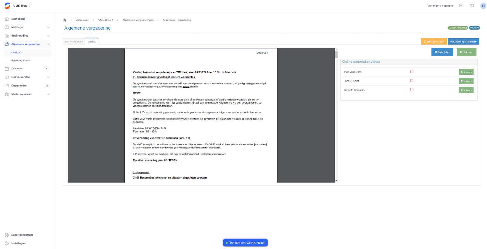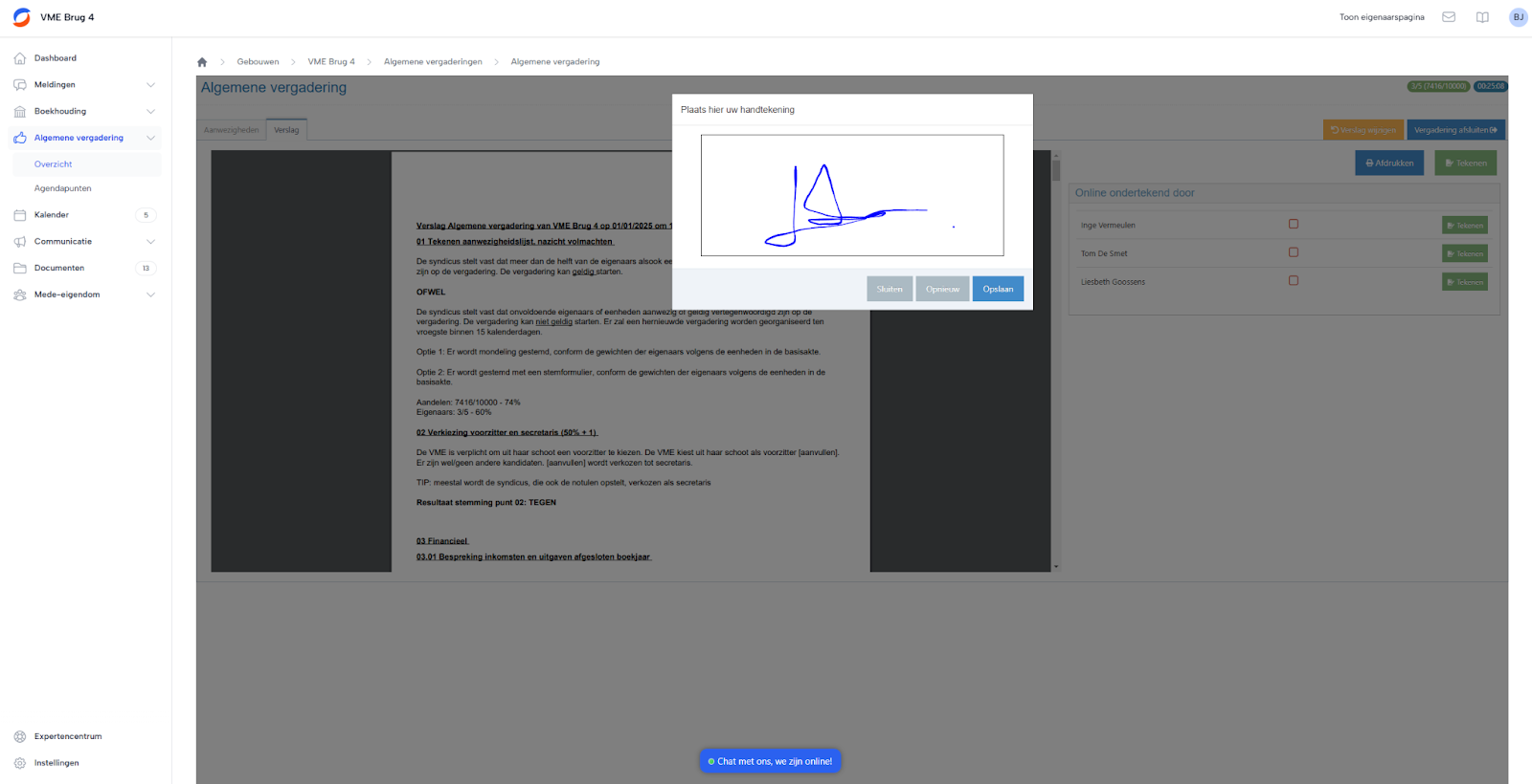 Vervolgens ga je het verslag ondertekenen. Dit kan digitaal gedaan worden via SyndicusOnline door de syndicus en door de deelnemers. Klik op Ondertekenen. Wil je handtekeningen opnieuw invoeren, klik dan op Verslag wijzigen.