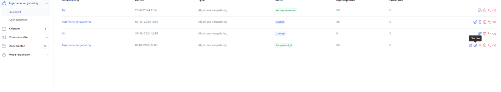 Het starten van een vergadering kan je doen via je overzicht van Algemene Vergaderingen,