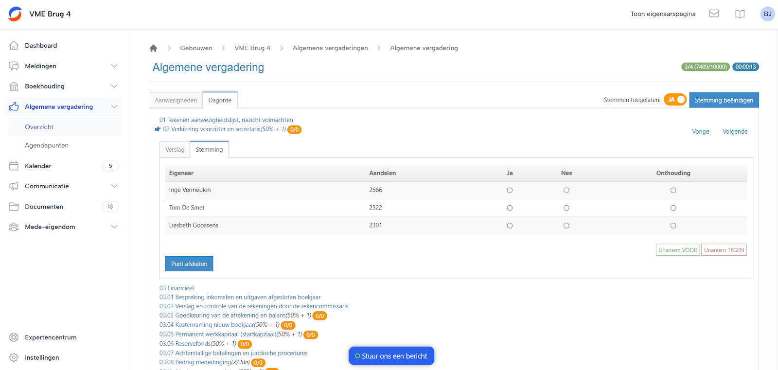 Kan ik de stemming van de Algemene Vergadering via SyndicusOnline doen? Zeker! Je kunt eenvoudig in de dagorde aangeven dat een stemming nodig is. Mede-eigenaars stemmen via het eigenaarsportaal, of je registreert de stemmingen zelf.