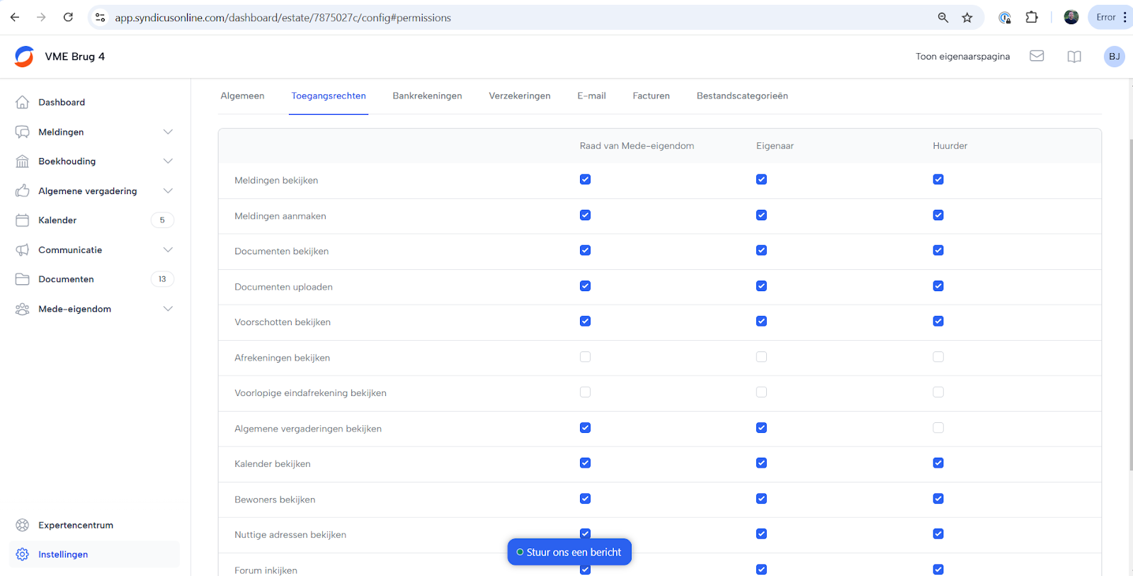In de instellingen kun je bij Toegangsrechten bepalen waar elke mede-eigenaar toegang toe heeft. Hier kun je voor elk type gebruiker, zoals eigenaren, huurders en bezoekers, instellen welke documenten zij kunnen inzien. Door de juiste opties aan of uit te vinken, beheer je eenvoudig de toegangsrechten.