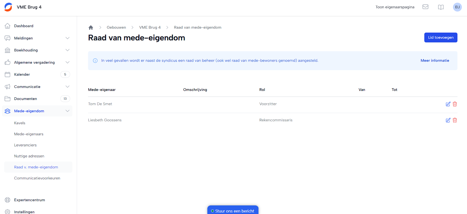 Om een lid toe te voegen aan de raad van mede-eigendom, ga je eerst naar het menu Mede-eigendom. Selecteer vervolgens het onderdeel Raad van mede-eigendom. Hier klik je op Lid toevoegen aan de raad van mede-eigendom. Daarna kies je de functie (zoals voorzitter, bijzitter, secretaris, rekencommissaris, assistent-syndicus of lid) en selecteer je het gewenste lid.