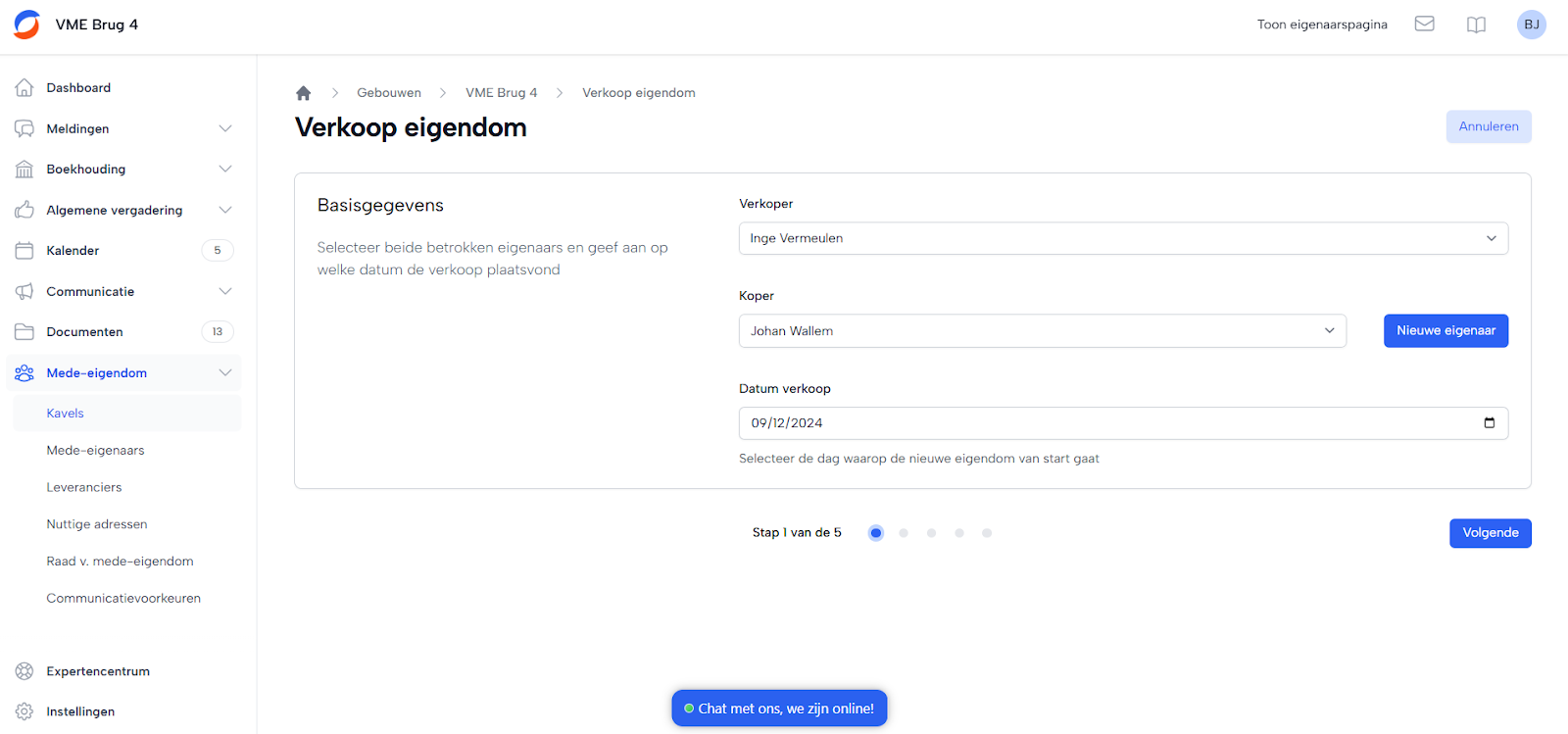 Je kunt de verkoop van een eigendom regelen via het menu “Mede-eigendom”. In dit menu navigeer je naar “Kavels” en kies je de optie “Verkoop kavel”. Het platform begeleidt je stap voor stap bij de administratieve afhandeling van de verkoop. Zodra de koper bekend is, kun je de verkoopgegevens invoeren in het systeem. Vervolgens moet je de verkochte kavels aanduiden binnen het platform. Aan het einde van het stappenplan bevestig je alle ingevoerde gegevens om de verkoop definitief vast te leggen.