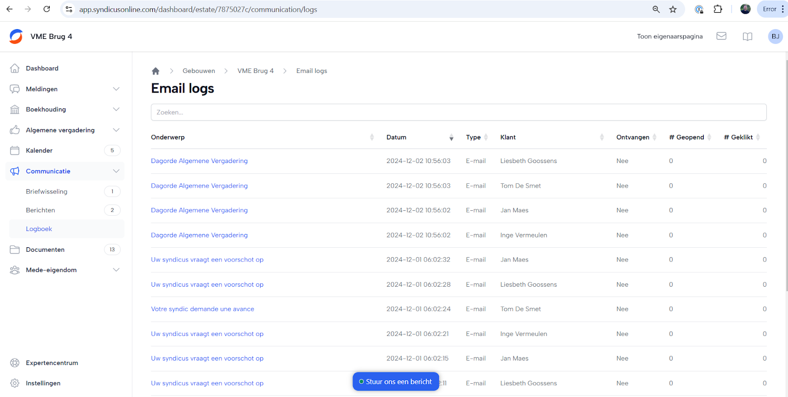 Als een mede-eigenaar zich heeft uitgeschreven voor e-mails, ontvangt hij/zij alleen nog mails met betrekking tot voorschotten van de syndicus. Andere e-mails, zoals berichten, meldingen en updates, worden niet meer verstuurd.