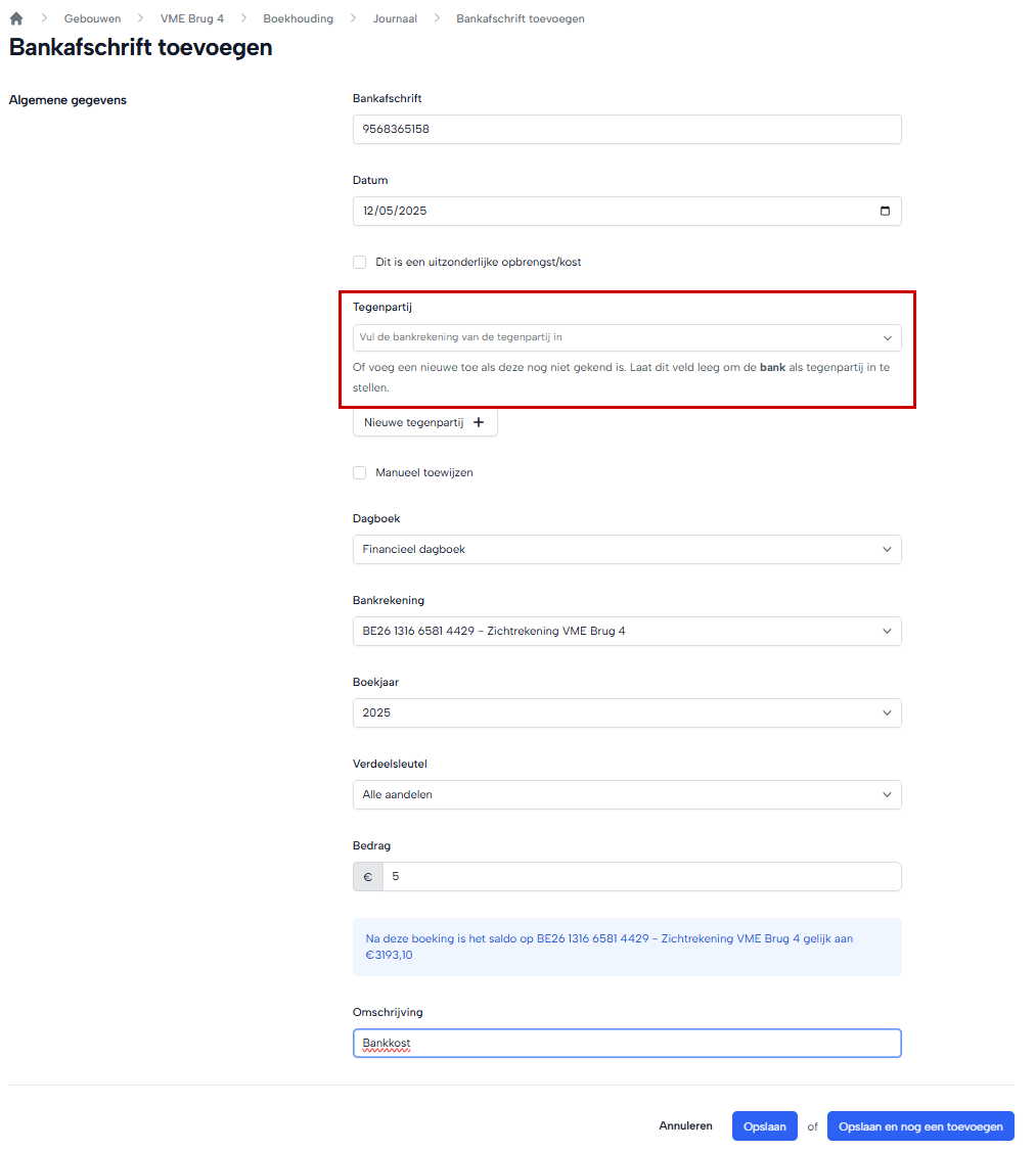 Om dit in SyndicusOnline correct af te punten geef je de kost als bankafschrift in zoals elk ander bankafschift maar je geeft geen tegenpartij in.