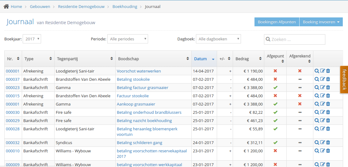 U ziet nu een overzicht van alle boekingen die zijn ingegeven. Bovenaan de tabel kan u de boekingen sorteren op dagboek (type), boekjaar en periode: