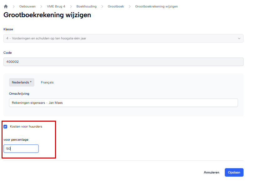 - Vink bij de rekening Kosten voor huurders aan, en geef optioneel een percentage in waarvoor de kost aan de huurders afgerekend zal worden en sla op