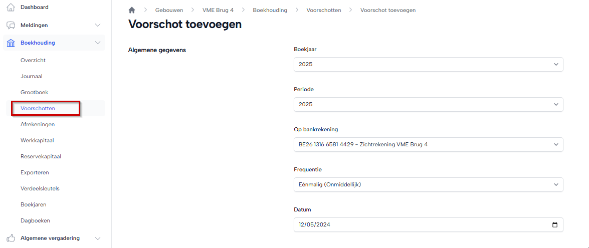Je kunt een voorschot aanmaken door naar Boekhouding → Voorschotten te gaan. Klik daar op Voorschot toevoegen een nieuw voorschot aan te maken.
