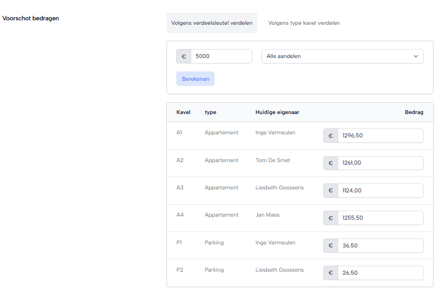 Per kavel kies je het bedrag van het voorschot. Je kan het bedrag laten berekenen met een verdeelsleutel, per type kavel of manueel.