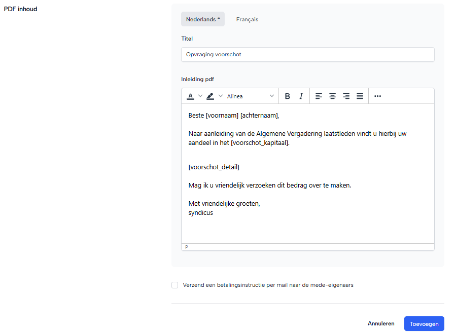 Wanneer je aanvinkt: Verzend een betalingsinstructie per mail naar de mede-eigenaars wordt het voorschot met overschrijvingsformulier per mail naar de mede-eigenaars gestuurd.